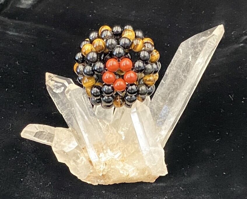 このフラーレンは、ジャスパー、オブシディアン、タイガーアイ、スモーキークォーツ、オニキスの魅力的な組み合わせを実現しています。ジャスパーは安定感をもたらし、オブシディアンは負のエネルギーを取り除く力を発揮します。そして、タイガーアイは判断力を高め、スモーキークォーツとオニキスが強力な守護のエネルギーを与え、ポジティブな変化へと導いてくれる存在です。これらが調和することで、あなたのライフスタイルに新たなエネルギーの流れを生み出します。